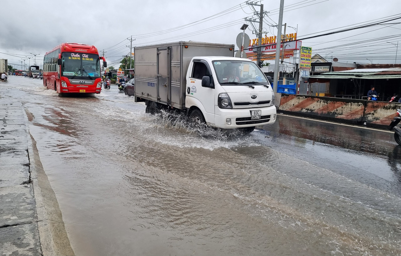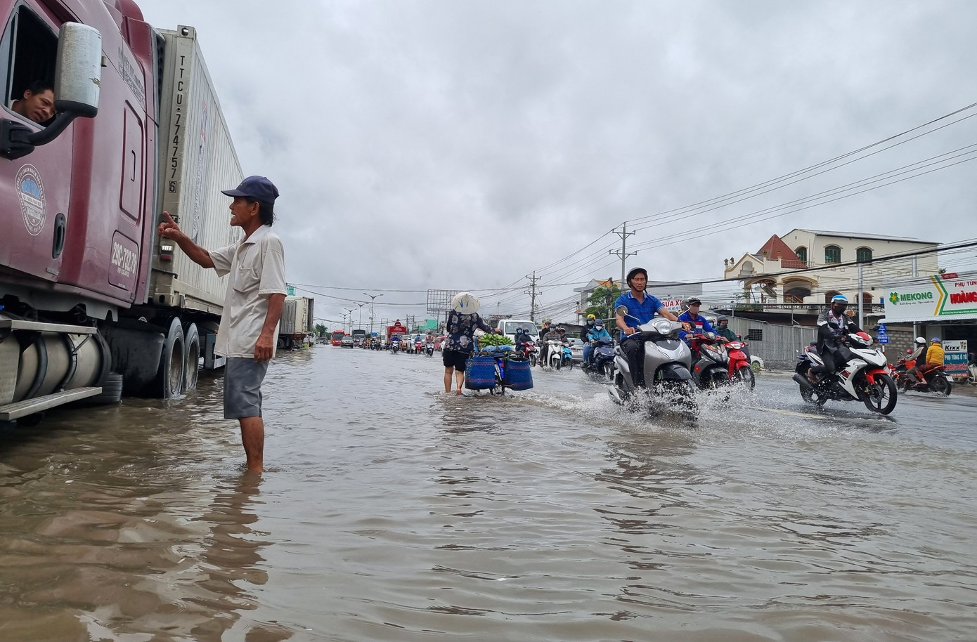 TPO - Ngày 4/9, triều cường dâng cao đã làm nước tràn qua Quốc lộ 1 đoạn qua thị xã Bình Minh, tỉnh Vĩnh Long, gây ùn tắc giao thông cục bộ.