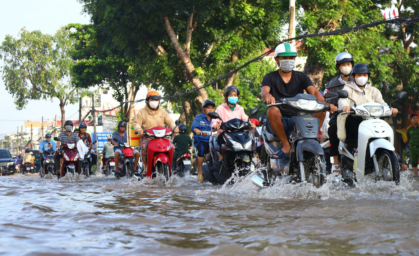 | Mặt đường Cách Mạng Tháng Tám, Bùi Hữu Nghĩa... ngập sâu trong nước. |
