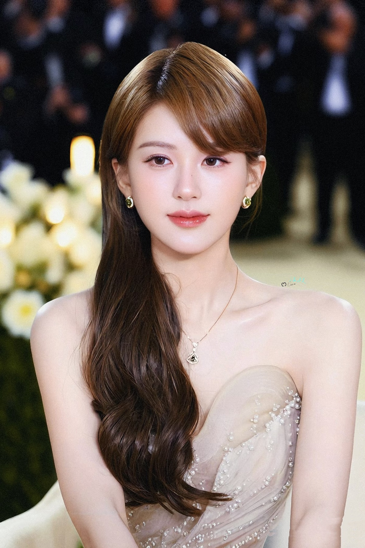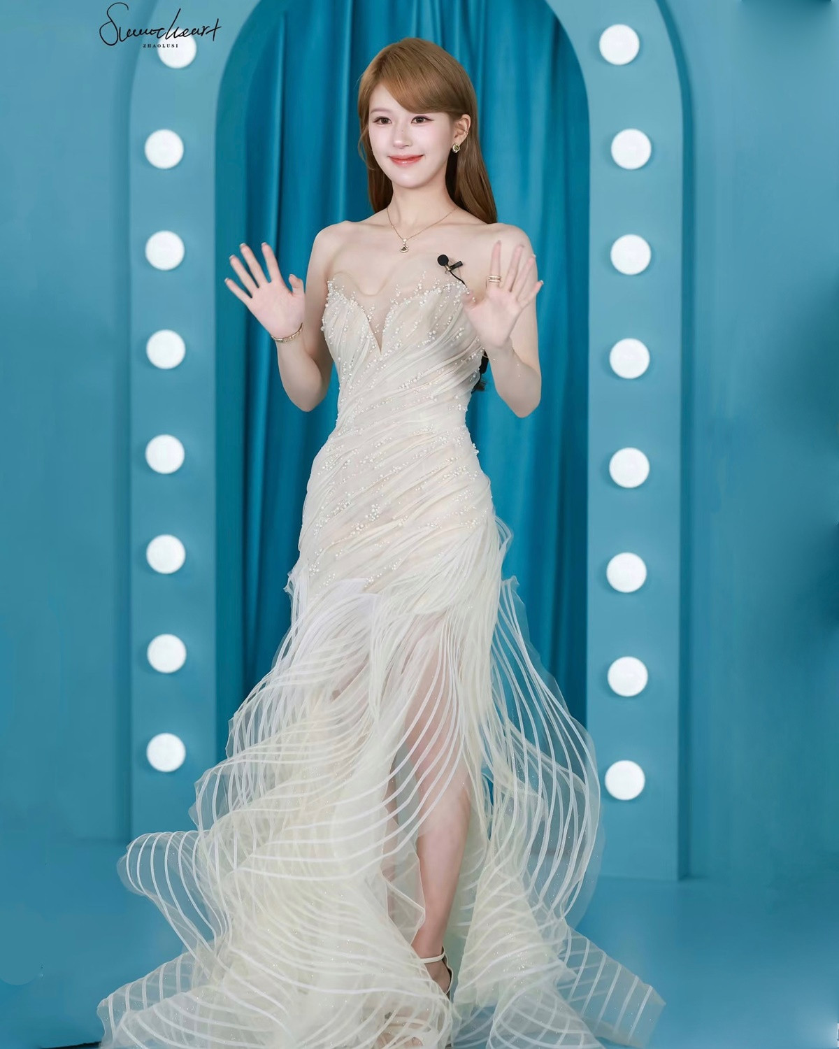 Ở lần tái xuất này, nữ diễn viên mang đến diện mạo rạng rỡ, sáng bừng xinh như công chúa, cho thấy hình ảnh và tinh thần khỏe khoắn hơn. Triệu Lộ Tư xuất hiện với chiếc váy cao cấp trắng muốt đến từ thương hiệu Hacchic Couture, phối cùng trang sức đắt giá của Bulgari.
