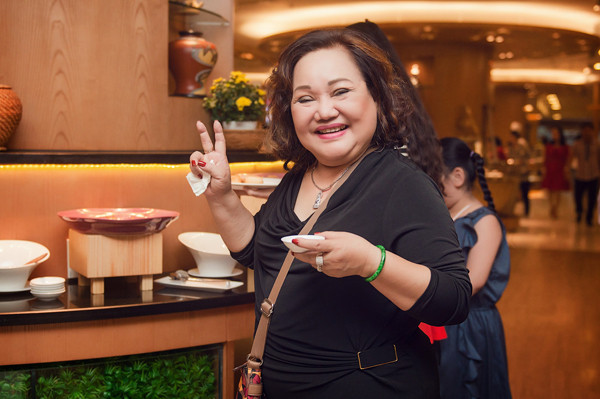 Triệu Thị Hà vui vẻ trò chuyện và ăn tiệc cùng mọi người.