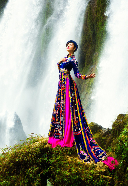 Hoa hậu Dân tộc 2011 diện áo dài mang họa tiết đặc trưng của người dân tộc Tày, yểu điệu tạo dáng giữa thiên nhiên hùng vỹ.