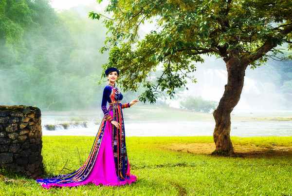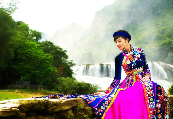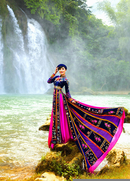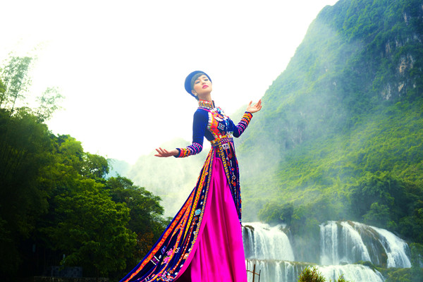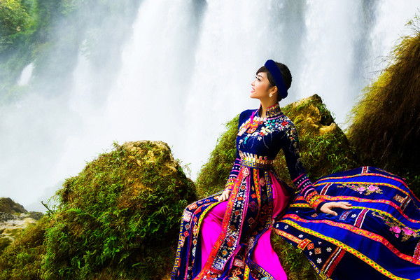 Triệu Thị Hà diện trang phục họa tiết thổ cẩm rực rỡ, thả hồn bên thác Bản Giốc hoang sơ, hùng vỹ.
