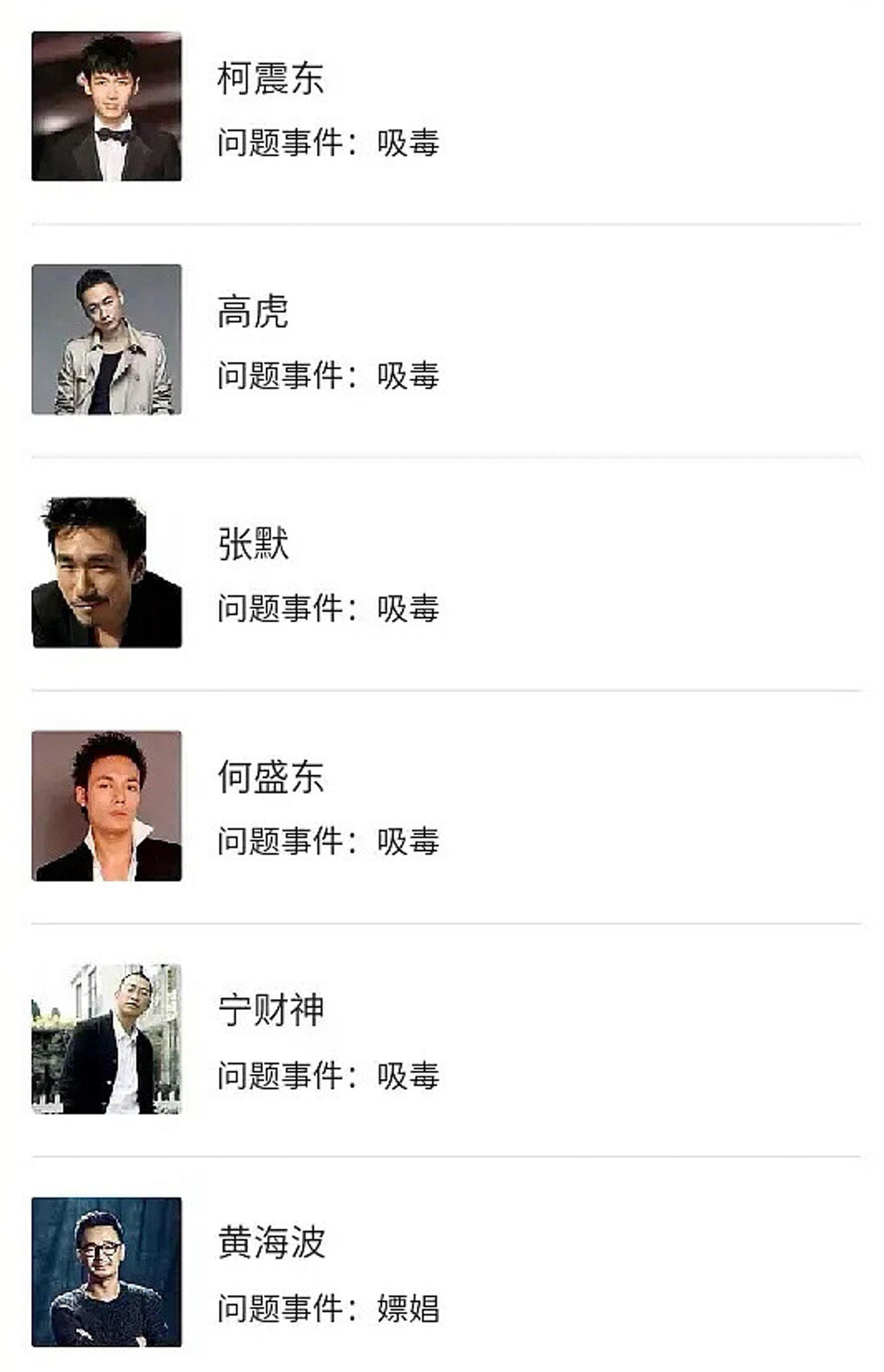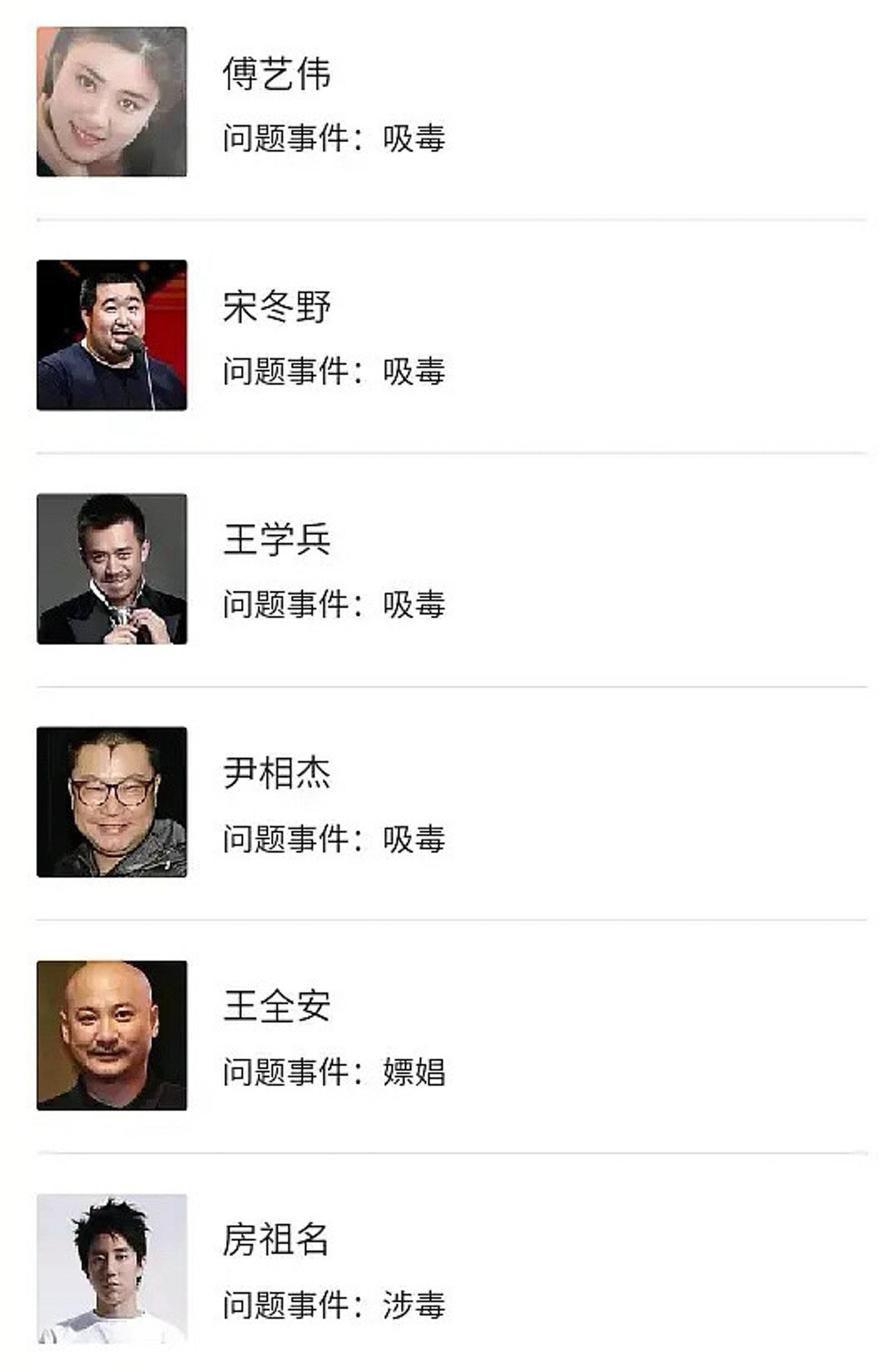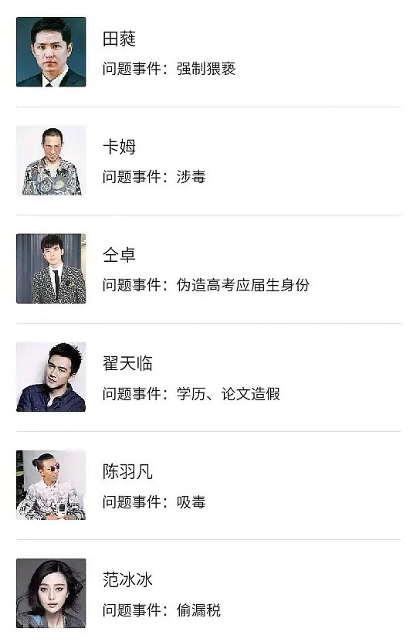 Danh sách bao gồm những ngôi sao vướng scandal gần đây như Trương Triết Hạn “chụp ảnh trước đền cấm thách thức tôn nghiêm của quốc gia”, Ngô Diệc Phàm “tình nghi hiếp dâm”, Trịnh Sảng “liên quan đến trốn thuế và mang thai hộ”, Hoắc Tôn “vi phạm đạo đức và luân lý”, Phạm Băng Băng “trốn thuế”…