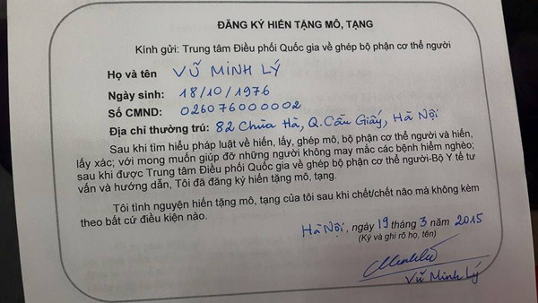 Mình nghĩ con người sau khi qua đời cũng chẳng còn gì cả về mặt thân xác, cho nên mình muốn dùng chính các bộ phận trong cơ thể của mình để cứu sống được ít nhất 10 người khác nữa. Thiết nghĩ đây là một việc làm tốt, sau này khi mất đi, đa số mọi người cũng dùng phương pháp hỏa thiêu, vậy tại sao mình không dành một phần cơ thể quý giá của mình để cứu lấy người bệnh. Đó chính là lí do khiến mình quyết định đăng kí hiến tặng mô tạng và thường xuyên kêu gọi mọi người thực hiện nghĩa cử cao đẹp này.