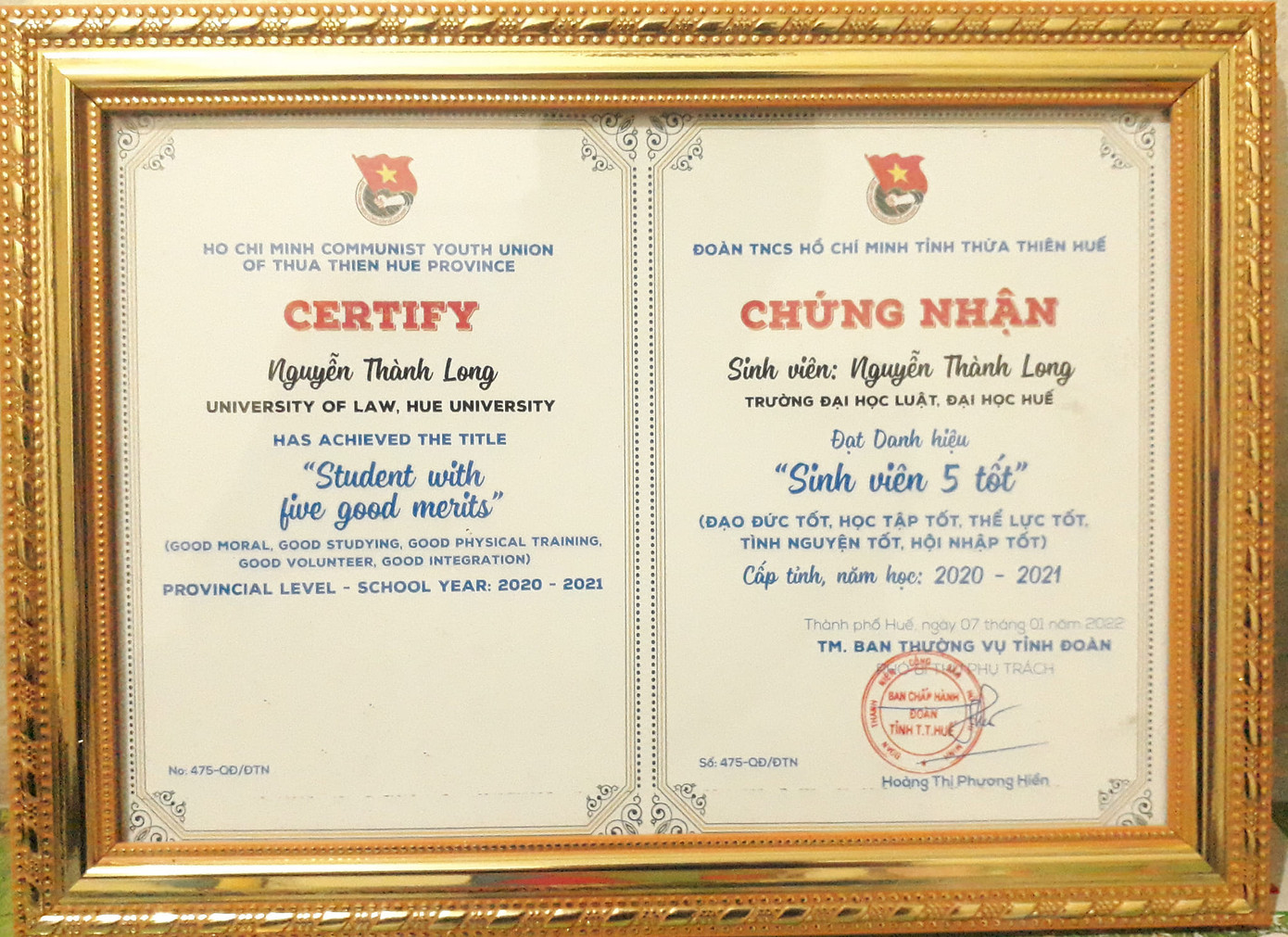 | 2 năm liền đạt danh hiệu Sinh viên 5 Tốt cấp Tỉnh Thừa Thiên Huế năm 2019- 2020 và năm 2020-2021. |
