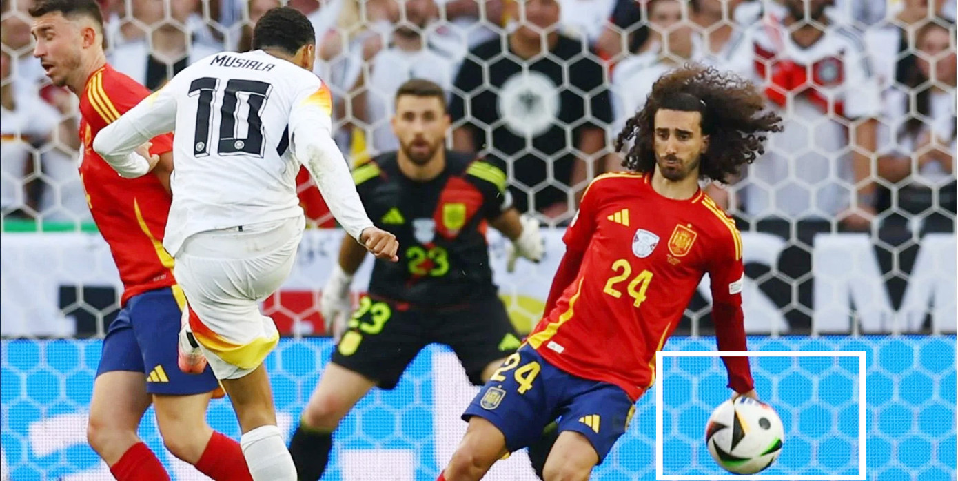 Tình huống này, Jamal Musiala nhận bóng ở chính giữa vòng cấm và tung ra cú đá căng. Marc Cucurella đã cản phá cú sút của Musiala bằng tay trái, song sau một thời gian nghe tổ VAR tư vấn, trọng tài Anthony Taylor cho trận đấu tiếp tục.