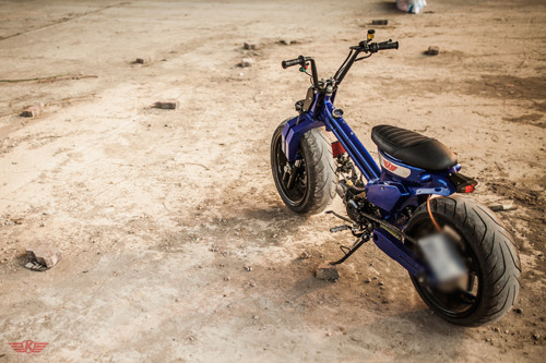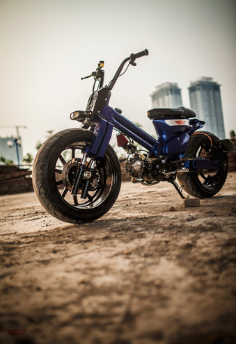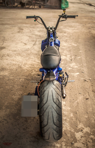 Bên cạnh đó, động cơ cũ cũng được độ lại lên 100 phân khối. Bản độ trang bị phanh đĩa cho cả hai bánh và được giấu gọn trong vành. Toàn bộ các chi tiết trên xe đều thực hiện thủ công.