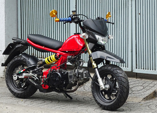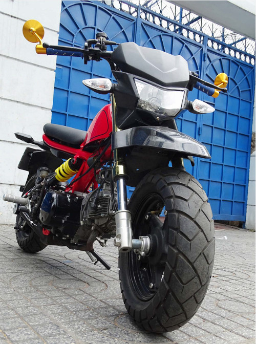 Dù là mini bike, nhưng chiếc xe trang bị cặp phuộc trước hành trình ngược, cặp bánh béo, cùng đèn pha nhìn bề thế như một chiếc phân khối lớn.