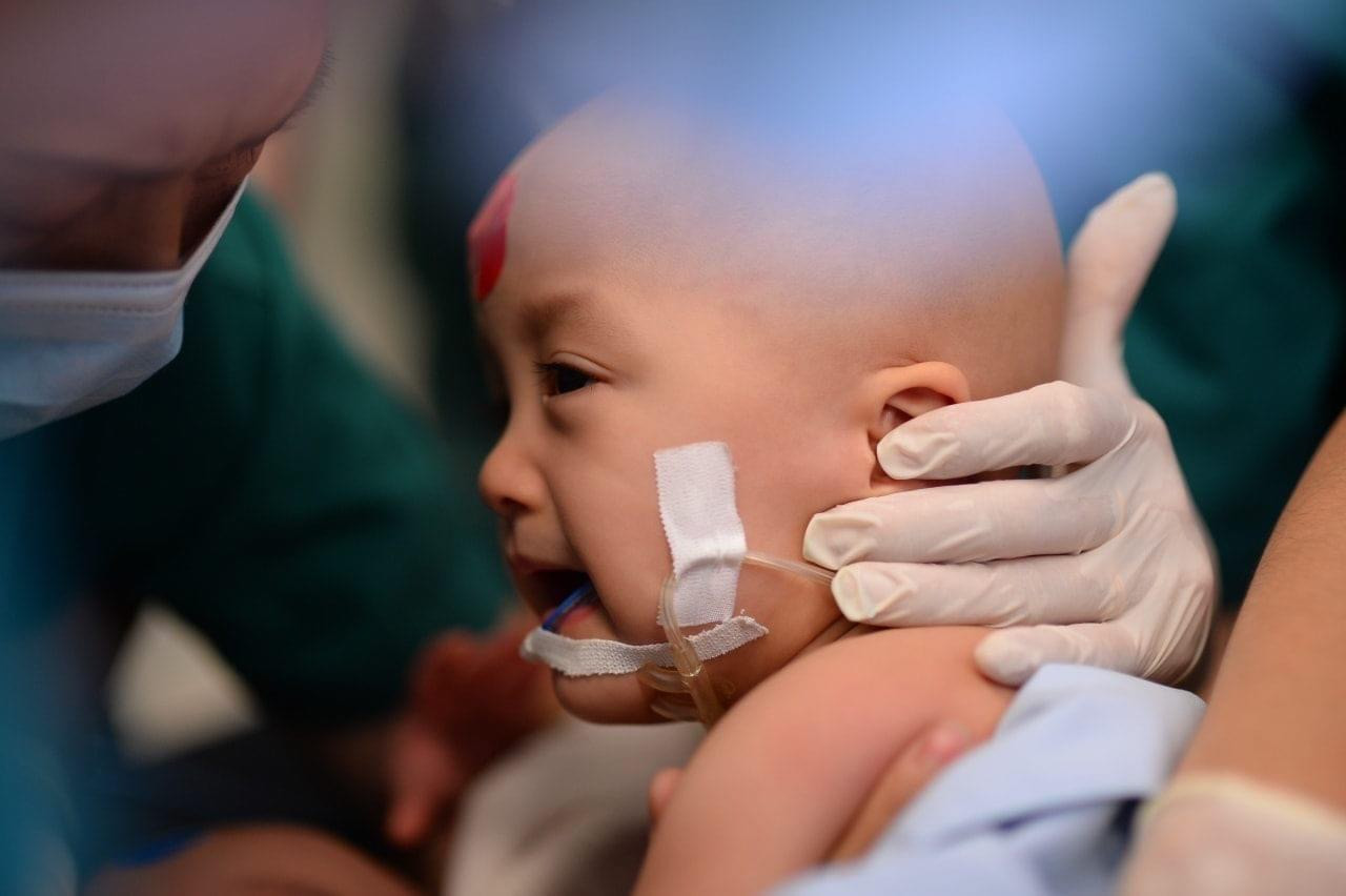 Các bác sĩ dán dấu stick đỏ và xanh trên trán hai bé để phân biệt: dấu xanh là Diệu Nhi, dấu đỏ là Trúc Nhi