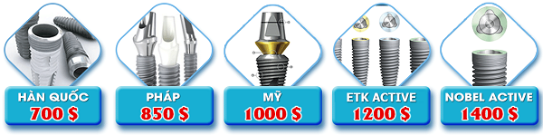 Implant Hàn Quốc giá 700 USD/đơn vị; Implant Pháp giá 850 USD/đơn vị; Implant Mỹ giá 1.000 USD/đơn vị; Implant ETK Active giá 1.200 USD/đơn vị (gắn răng liền); Implant Nobel Active giá 1.400 USD/đơn vị (gắn răng liền).