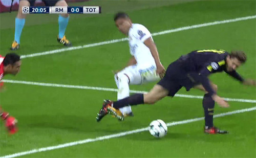 Tình huống gây tranh cãi diễn ra ở phút 20 trong trận Real - Tottenham, tối 17/10. Sau cú ngáng chân của Casemiro, Llorente mất thăng bằng và không kịp dứt điểm lập công cho Tottenham.