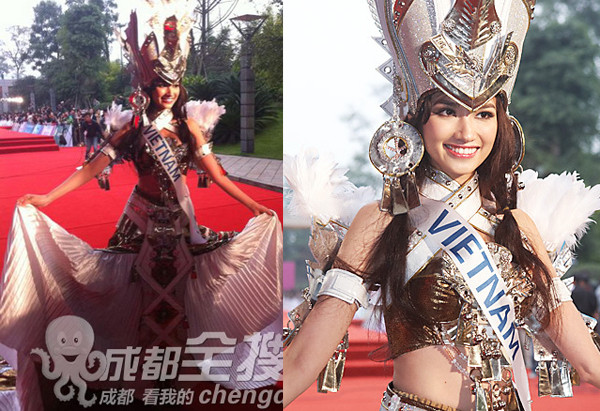 Đại diện Việt Nam trở thành một trong những thí sinh nổi bật nhất trong sự kiện này khi bộ váy của nhà thiết kế Long Dũng mô phỏng hình ảnh mẹ Âu Cơ với nhiều chi tiết rất cầu kỳ và ấn tượng đã khiến cánh săn ảnh liên tục chụp cô.