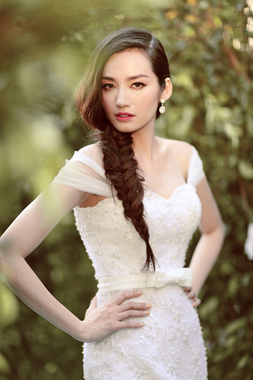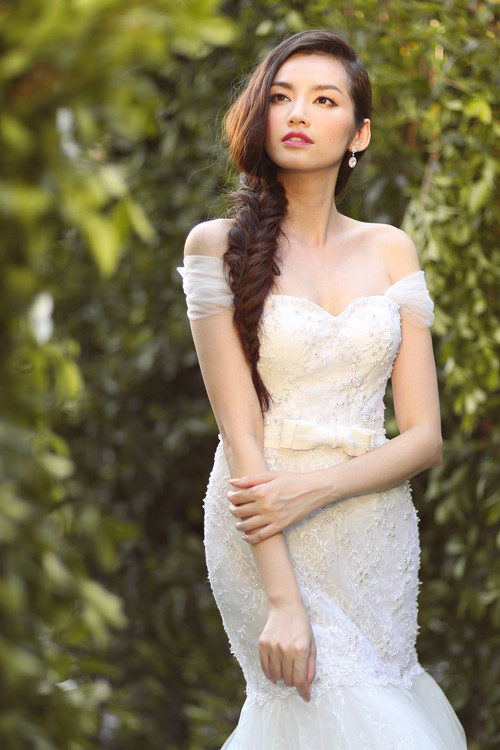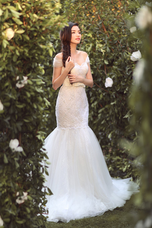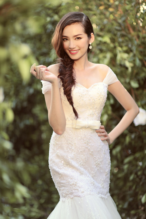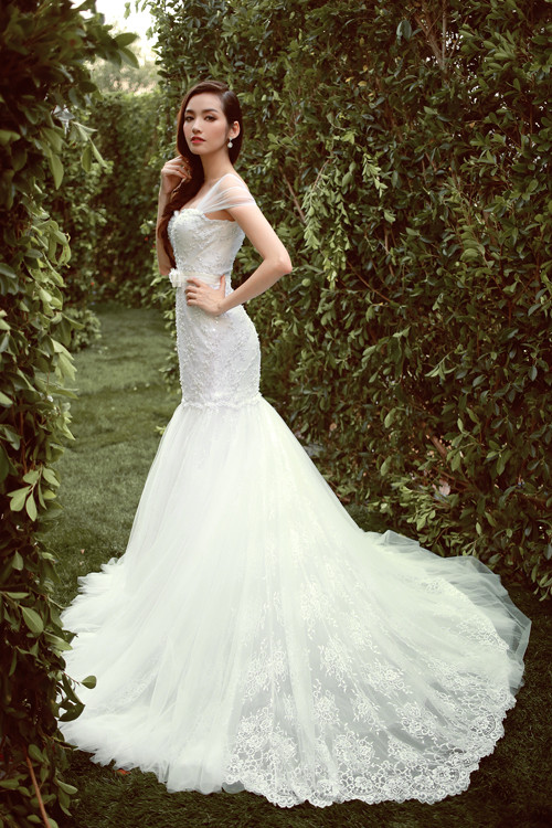 Trúc Diễm đẹp kiêu sa trong chiếc váy trắng muốt, dáng đuôi cá. Người đẹp như nàng công chúa lạc bước trong rừng.