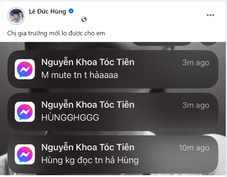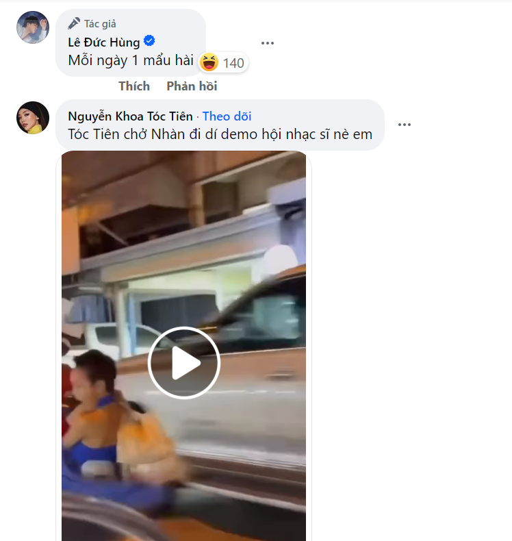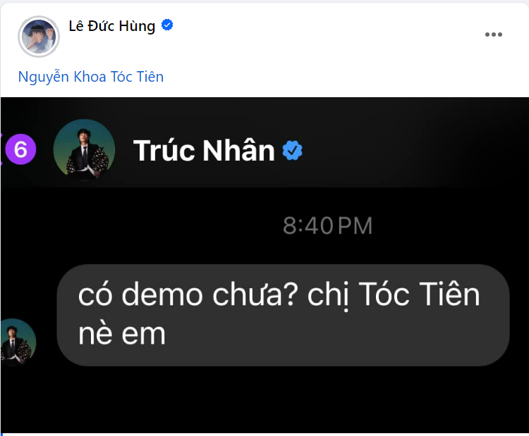 Mới đây, dòng trạng thái "bóc mẽ" đàn chị của nhạc sĩ Mew Amazing (Lê Đức Hùng) trên trang cá nhân khiến khán giả vô cùng thích thú. Mew Amazing đã công khai bị nữ ca sĩ Tóc Tiên "dí" tới cùng để đòi bản demo bài hát mới. Theo đó, nữ ca sĩ đã mượn tài khoản cá nhân của ca sĩ Trúc Nhân để nhắn tin cho nhạc sĩ Mew Amazing sau "năm lần bảy lượt" bị đàn em từ chối trả lời tin nhắn.