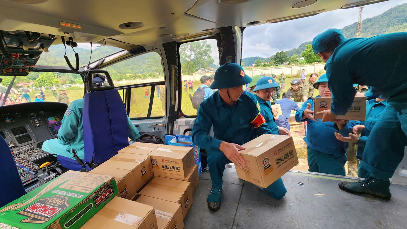 | Được lệnh của Bộ Quốc phòng, chiều 11/9, máy bay EC-155-B1 số hiệu VN-8621 của Công ty Trực thăng miền Bắc (Binh đoàn 18) đã cất cánh vận chuyển nhu yếu phẩm cứu trợ đồng bào vùng lũ huyện Nguyên Bình, tỉnh Cao Bằng. |