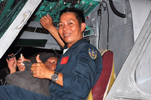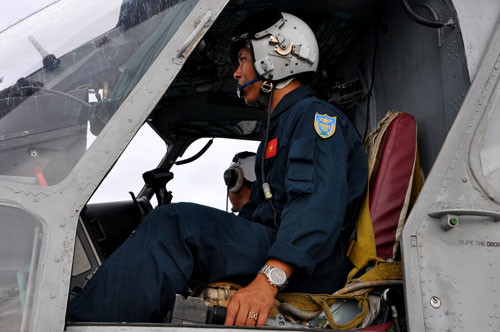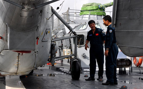 Đại úy Nguyễn Mạnh Việt (bên trái), Chỉ huy bay và thiếu tá Võ Cát Khánh (Phó Thuyền trưởng Quân sự tàu HQ-012) phối hợp chỉ huy giữa 2 lực lượng Không quân và Hải quân.