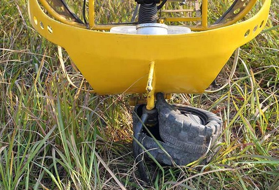 Anh Thắng hi vọng trong lần thử nghiệm này, chiếc trực thăng tự chế của mình sẽ có thể bay lên khỏi mặt đất tầm hơn 1m. (Trực thăng được kéo ra bãi thử bằng chiếc xe môtô ba bánh do anh tự sản xuất hoàn toàn thủ công).