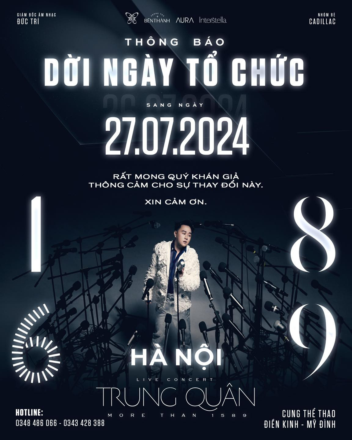 Ngày 21/7, ca sĩ Trung Quân đã đăng tải thông báo lùi lịch tổ chức concert tại Hà Nội một ngày so với thời gian khán giả đặt vé: "Trung Quân và Ban tổ chức xin phép được dời lịch diễn Live Concert 1689 sang ngày 27/7/2024. Rất mong tất cả quý vị khán giả thông cảm cho sự thay đổi này. Đồng thời, chúng tôi bày tỏ niềm tiếc thương vô hạn đến sự mất mát to lớn này của dân tộc".