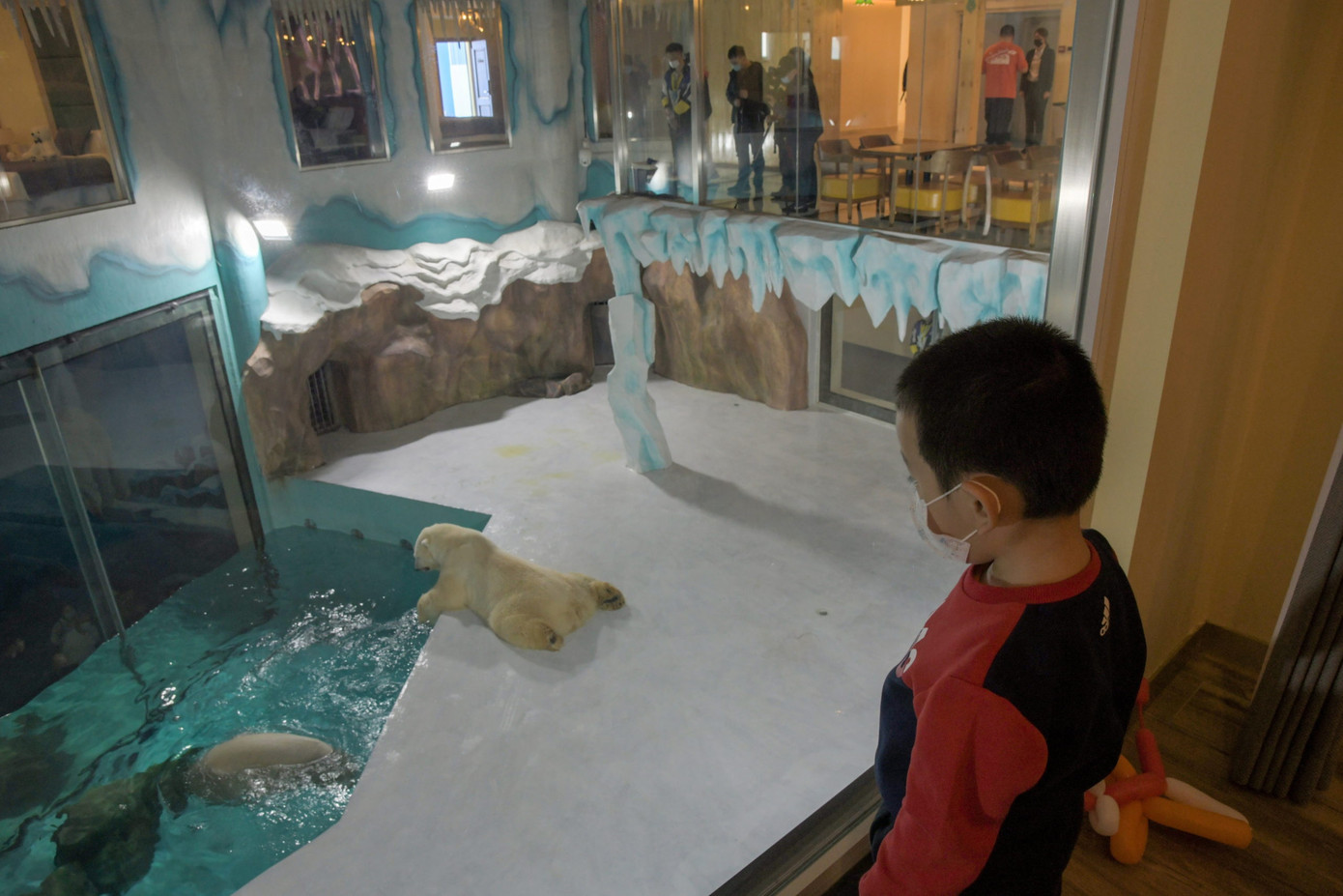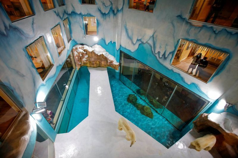 Các phòng nghỉ của khách sạn này phần lớn đều có cửa sổ hướng vào chuồng gấu, để du khách tận hưởng cảm giác “sống với gấu Bắc Cực 24/24”.