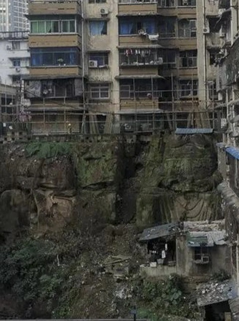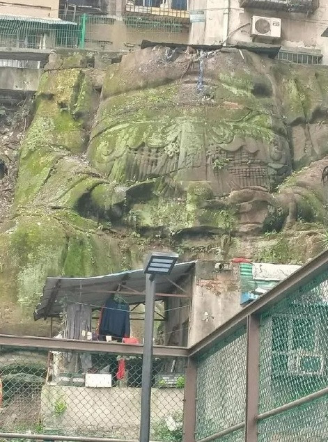 Theo SCMP, bức tượng cao 9m bị mất đầu nằm trên trên một vách đá dưới 2 tòa chung cư ở huyện Nam Ngạn (Trung Khánh, Trung Quốc).