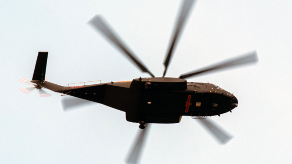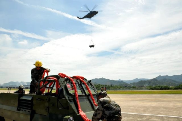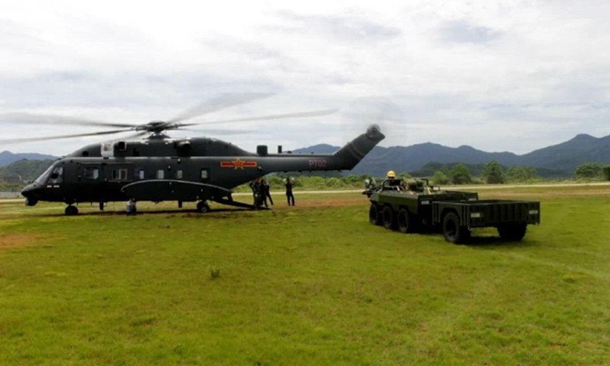 Một chiếc trực thăng Z-8L của Quân Giải phóng Nhân dân Trung Quốc chuẩn bị vận chuyển xe tấn công mọi địa hình. Ảnh: Ảnh chụp màn hình từ Đài truyền hình Trung ương Trung Quốc