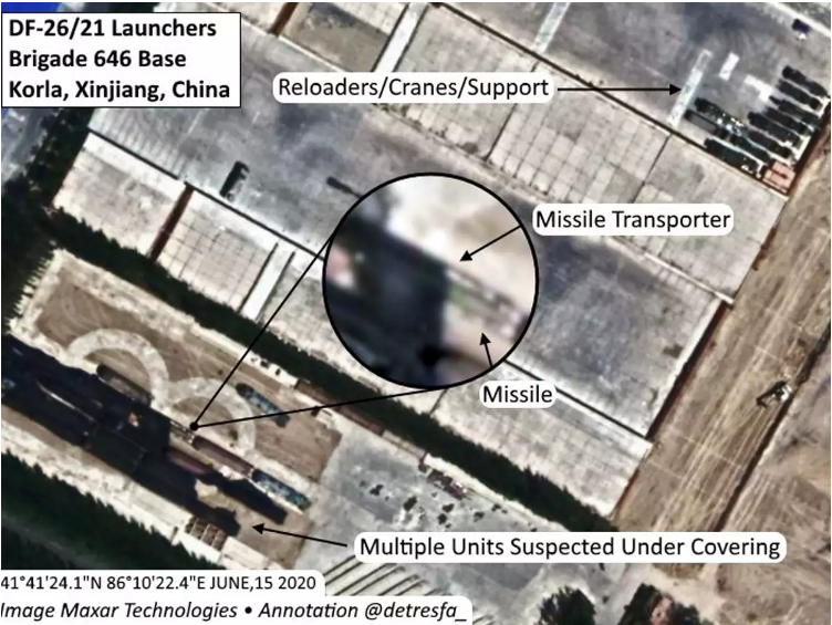 Hình ảnh từ vệ tinh được phát Open Intelligence Source Detresfa cung cấp cho thấy tên lửa DF-26/21 có mặt tại căn cứ quân sự Corla ở tỉnh Tân Cương cách biên giới của Ấn Độ chỉ 500 km.