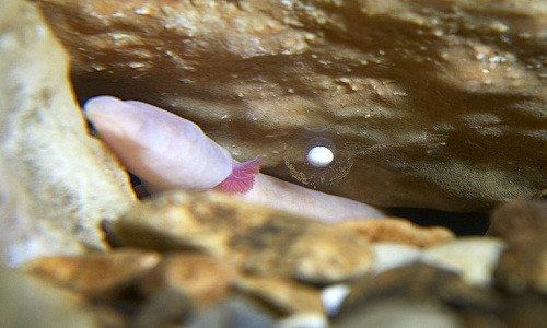 Ca sinh được ghi lại trực tiếp giống như một phép màu, theo mô tả của phát ngôn viên cơ quan quản lý hang động. "Chỉ hai con manh giông non nở thành công từ 500 quả trứng trong tự nhiên", phát ngôn viên cho biết. Loài vật có hình dáng giống lươn đã sống trong hang động Postojna nổi tiếng, cách thủ đô Ljubljana của Slovenia 50 km về phía tây nam, suốt hàng triệu năm. Ảnh: Iztok Medja.