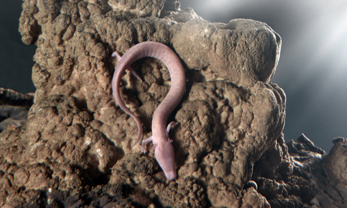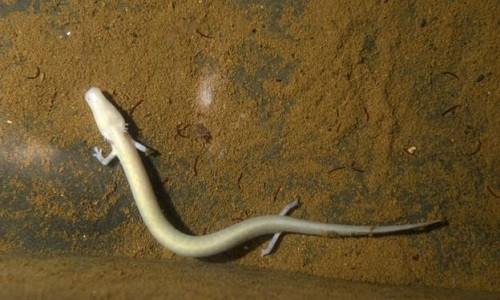 Với chiều dài tối đa 35 cm, loài manh giông mù có 4 chi nhỏ. Đôi khi còn gọi là "cá người", manh giông có ba chiếc mang màu hồng ở mỗi bên mõm. Lớp da màu hồng trong suốt khiến các cơ quan nội tạng lộ rõ. Ảnh: Youtube.
