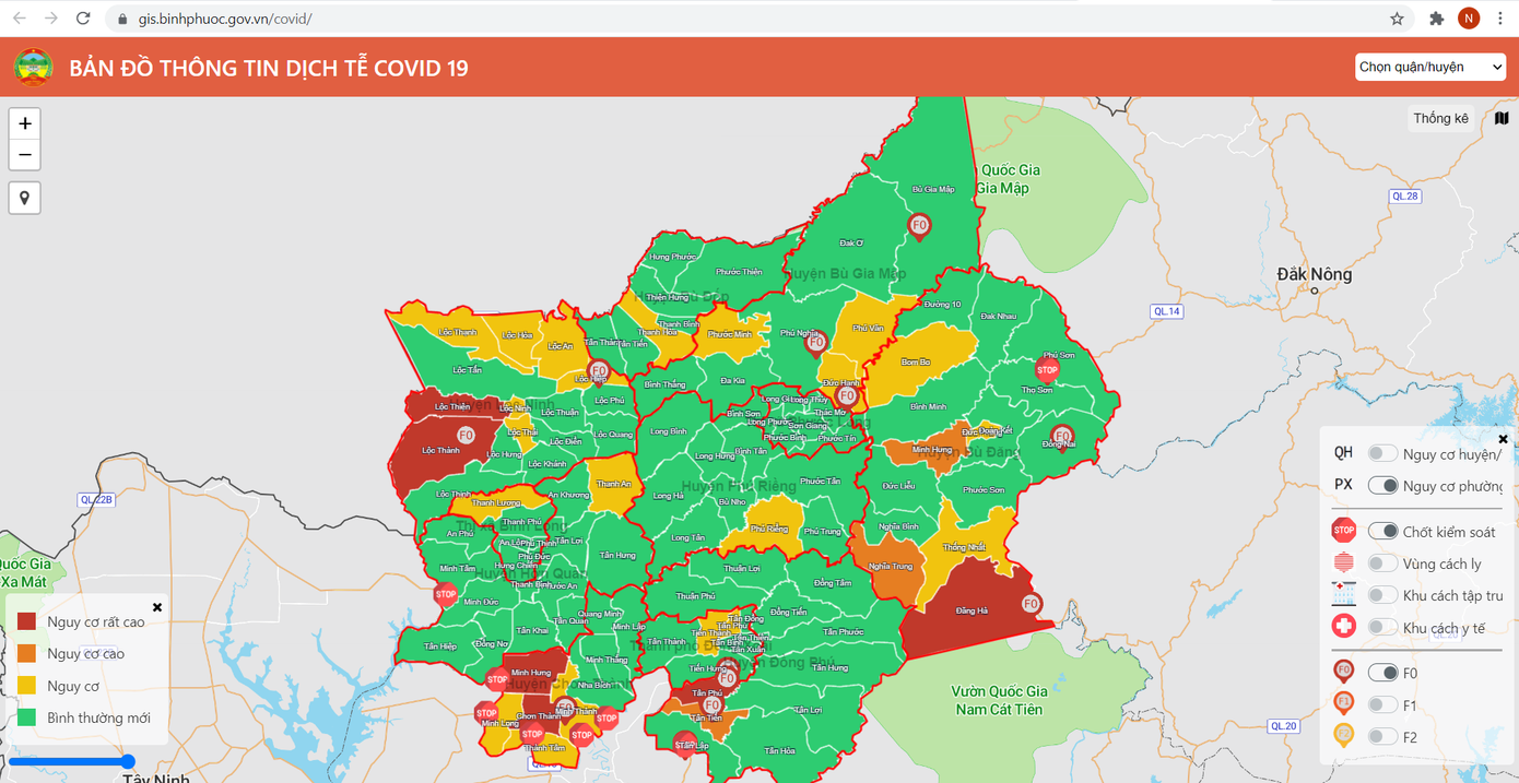 Để cung cấp thông tin chính xác và kịp thời cho toàn bộ người dân Bình Phước về tình hình dịch bệnh, hệ thống bản đồ số dịch tễ COVID-19 đã nhanh chóng được triển khai và cập nhật đầy đủ thông tin các ca nhiễm, nghi nhiễm (F0, F1, F2); các vùng, khu vực cách ly; vị trí chốt kiểm soát; công bố các địa bàn hành chính nguy cơ cao,… được trung tâm IOC cập nhật theo thời gian thực. Thông tin chính thức , tin cậy và được công khai minh bạch giúp người dân hiểu rõ và yên tâm phối hợp cùng Chính quyền tỉnh để kiểm soát tốt dịch bệnh.