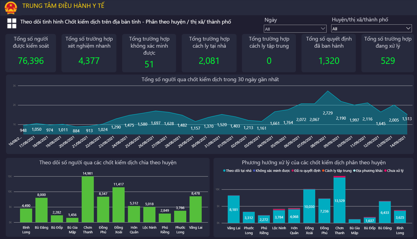 Đồng thời, toàn bộ thông tin và dữ liệu được phân tích một cách nhanh chóng, sâu sắc và đa chiều thông qua hệ thống bảng điều hành (dashboard) tại trung tâm IOC để giúp lãnh đạo Tỉnh thấy ngay bức tranh toàn cảnh về tình hình dịch bệnh, số liệu được biễu diễn trực quan với mức độ phân tích cao thông qua biểu đồ để thấy rõ sự biến động tăng giảm về số ca dương tính, ca tử vong, ca bình phục, tiêm chủng… mức độ phân bố các ca nhiễm, phân bố vùng nguy cơ cao với phạm vi nhỏ nhất, các vùng xanh,… được thể hiện trên bản đồ số của tỉnh.
