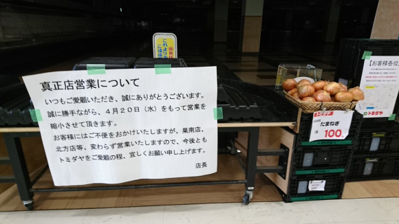 Trung tâm hiện chỉ mở cửa đúng một lối ra vào, và chỉ có một quầy hàng duy nhất, bán đúng một loại mặt hàng: hành tây. Thậm chí, quầy hàng này còn không có nhân viên. Khách đến mua sẽ tự lấy hành rồi thả tiền vào hộp. Mỗi củ hành có giá 100 yen Nhật.