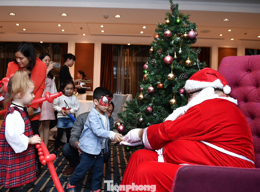 Ông già Noel ngồi bên cây thông tặng quà sớm cho các trẻ em nhỏ