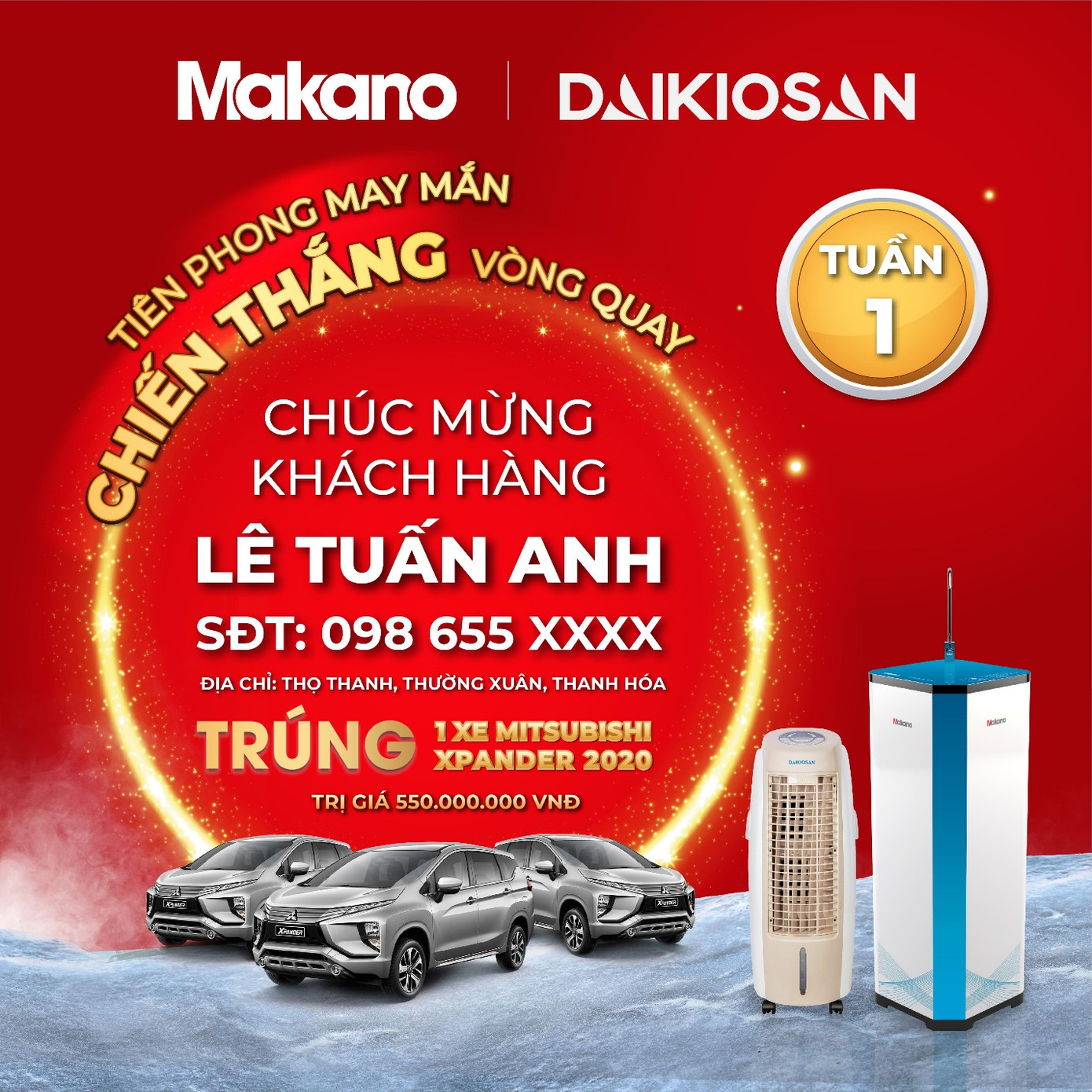 Phỏng vấn anh Lên Tuấn Anh qua điện thoại, anh vui mừng cho biết: “Tôi vô cùng bất ngờ và không bao ngờ nghĩ mình lại may mắn đến vậy. Vì thời tiết nóng nực quá nên ngày 21/5, tôi đã mua 1 cái máy làm mát và 1 cái máy lọc nước Daikiosan, Makano để giải nhiệt cái nóng mùa hè. Không ngờ, khi tham gia trò chơi “Lật ô trúng thưởng” tôi đã trúng chiếc điện thoại. Và hôm nay bất ngờ và sung sướng hơn khi lại trúng thêm quà khủng quá là chiếc ô tô Mitsubishi”.