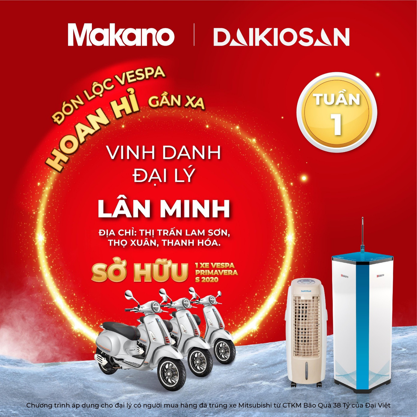 Nhờ khách hàng may mắn trúng thưởng ô tô nên đại lý Lân Minh (tại thị trấn Lam Sơn – Thọ Xuân – Thanh Hóa) cũng được thương hiệu Daikiosan, Makano tặng 1 chiếc xe Vespa Primavera trị giá 76,5 triệu đồng.