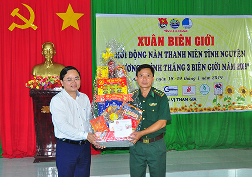 Anh Lâm Thành Sĩ, Bí thư Tỉnh đoàn An Giang tặng quà cho người nghèo ẢNH: HÒA HỘI Dịp này, Trung ương Đoàn tặng 50 suất quà cho các chiến sỹ và gia đình chính sách, cán bộ, đoàn viên, thanh thiếu nhi có hoàn cảnh khó khăn của 02 xã, phường biên giới là xã Vĩnh Tế và phường Vĩnh Nguơn (TP. Châu Đốc).