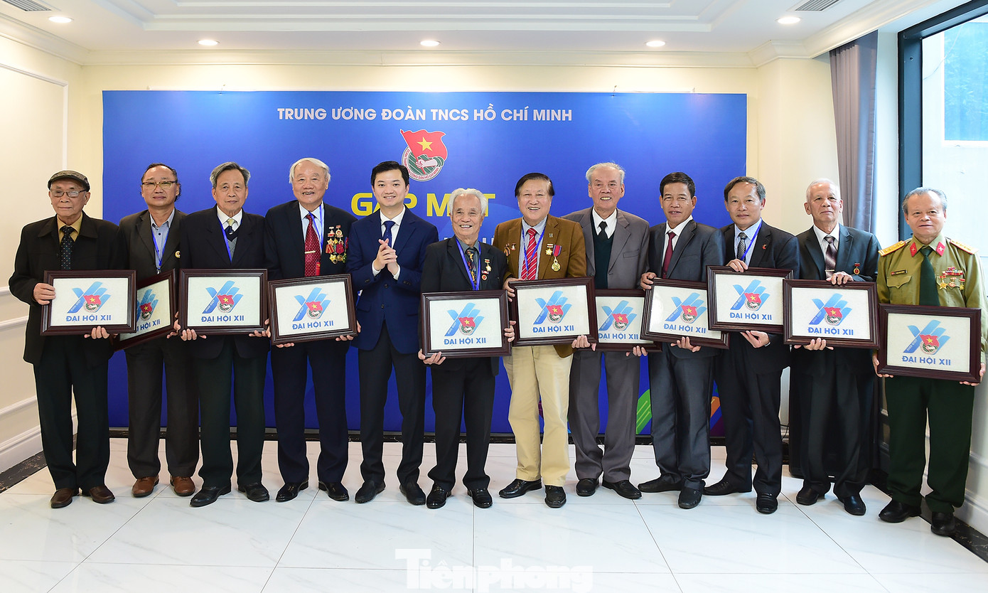 | Bí thư T.Ư Đoàn Nguyễn Minh Triết trao tặng logo Đại hội Đoàn toàn quốc lần thứ XII tới các cựu chuyên gia T.Ư Đoàn làm nhiệm vụ quốc tế tại Campuchia giai đoạn 1979 - 1989. Ảnh: Xuân Tùng |