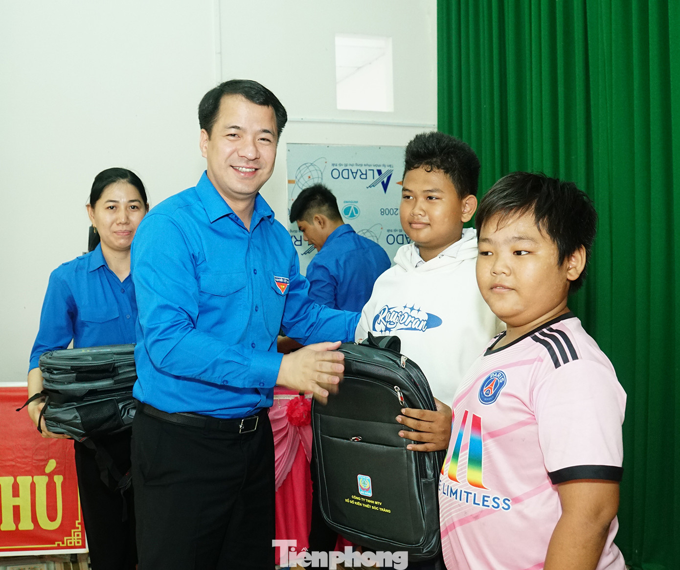 | Bí thư Trung ương Đoàn tặng quà cho học sinh tại Sóc Trăng. Ảnh: Hòa Hội |