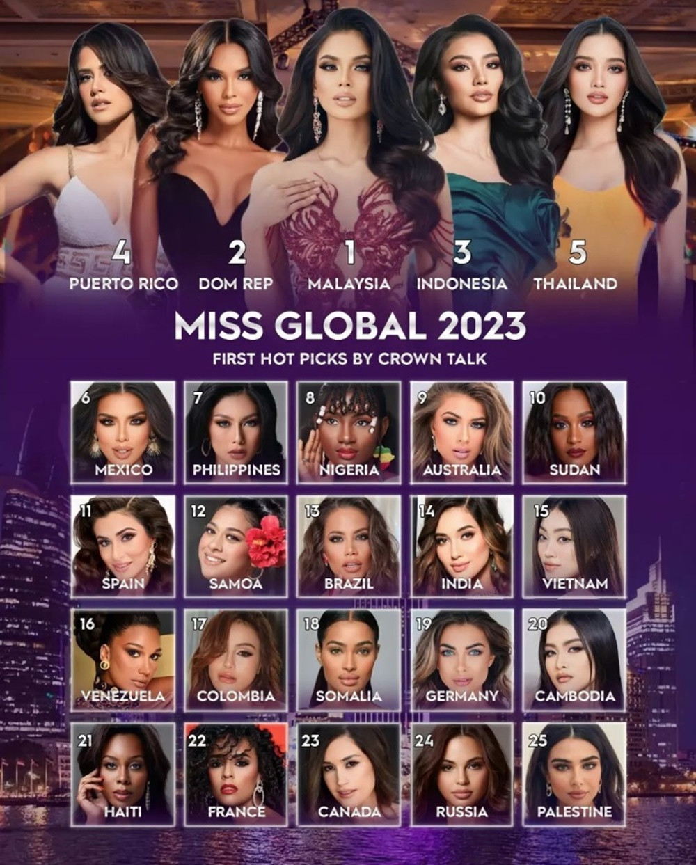 Chuyên trang nhan sắc quốc tế Glamour Universe Official dự đoán đại diện Việt Nam sẽ lọt Top 10 ở vị trí thứ 6. Đại diện Thái Lan được dự đoán đăng quang. Đại diện Thái Lan tại cuộc thi này là người đẹp Chonnikarn Supittayaporn, cô vốn được cử đi thi Miss World lần thứ 71. Tuy nhiên, do thời gian tổ chức của cuộc thi liên tục bị đẩy lùi, đồng thời đơn vị tổ chức mất bản quyền, nên người đẹp đã được chuyển sang thi Miss Global 2023. Chonnikarn Supittayaporn nhận được sự cổ vũ nồng nhiệt từ nàng hậu hot nhất Thái Lan hiện nay: Á hậu 1 Miss Universe 2023 Anntonia Porsild. Anntonia cũng sẽ làm MC cho đêm Chung kết Miss Global 2023 sắp tới, và theo một nguồn tin không chính thống, có thể cô sẽ mặc thiết kế dạ hội của một NTK Việt tại sự kiện này.