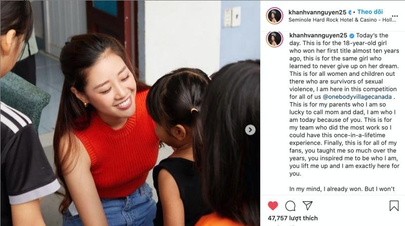 Tâm thư của Hoa hậu Khánh Vân được viết bằng tiếng Anh, tạm dịch như sau: “Cuối cùng cũng đến ngày này. Ngày dành cho cô gái 10 năm trước giành được danh hiệu đầu tiên, cô gái năm đó 18 tuổi, cũng là cô gái ấy đã học được cách không bao giờ từ bỏ ước mơ. Ngày hôm nay là dành cho tất cả những người phụ nữ và trẻ em đã sống sót dù bị lạm dụng tình dục, tôi ở đây, trong cuộc thi này vì tất cả chúng ta.