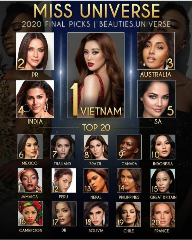Sát giờ G, có thêm một chuyên trang sắc đẹp dự đoán Hoa hậu Khánh Vân sẽ giành vương miện năm nay, đó là chuyên trang Beauties Universe, khiến cho người hâm mộ nước nhà càng có thêm niềm tin vào Khánh Vân.