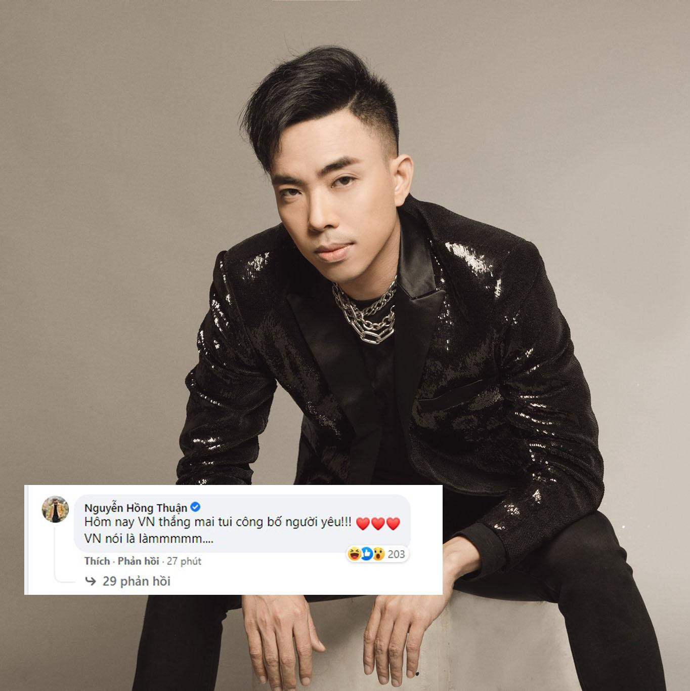 Bên dưới bài đăng "Sẽ làm gì nếu tối nay đội tuyển Việt Nam giành chiến thắng", nhạc sĩ Nguyễn Hồng Thuận "chơi lớn" khi tuyên bố: "Mai tui công bố người yêu! Việt Nam nói là làm!". Bình luận cổ vũ tuyển Việt Nam theo cách đặc biệt của nam nhạc sĩ đã thu hút hơn 200 lượt react từ cư dân mạng.