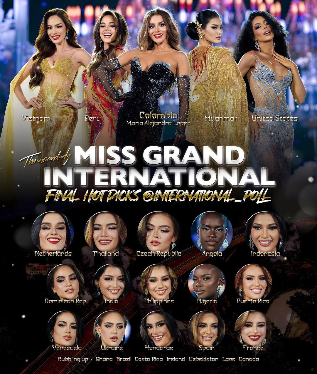 Chuyên trang International Poll cũng dự đoán Hoa hậu Colombia sẽ đăng quang, Á hậu 1 là Hoa hậu Peru, Hoa hậu Myanmar là Á hậu 2 và Hoa hậu Lê Hoàng Phương là Á hậu 3.