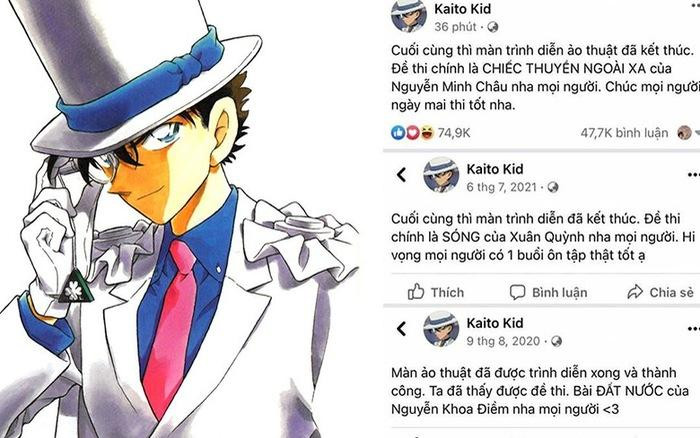 Trước đó, fanpage có tên Kaito Kid gây xôn xao mạng xã hội khi 3 năm liên tiếp đoán trúng tác phẩm văn học có trong đề thi môn Văn kỳ thi tốt nghiệp THPT. Đáng chú ý, fanpage này sử dụng hình ảnh của nhân vật "siêu đạo chích kid" trong truyện Thám tử lừng danh Conan và liên tục đề cập đến việc "trộm đề thi Văn THPT". Bắt nguồn từ một trò đùa nhưng fanpage đã gây xôn xao mạng xã hội ngay sau khi kết thúc môn Văn kỳ thi tốt nghiệp THPT Quốc gia năm 2022 đồng thời tạo ra hiểu lầm lộ đề.