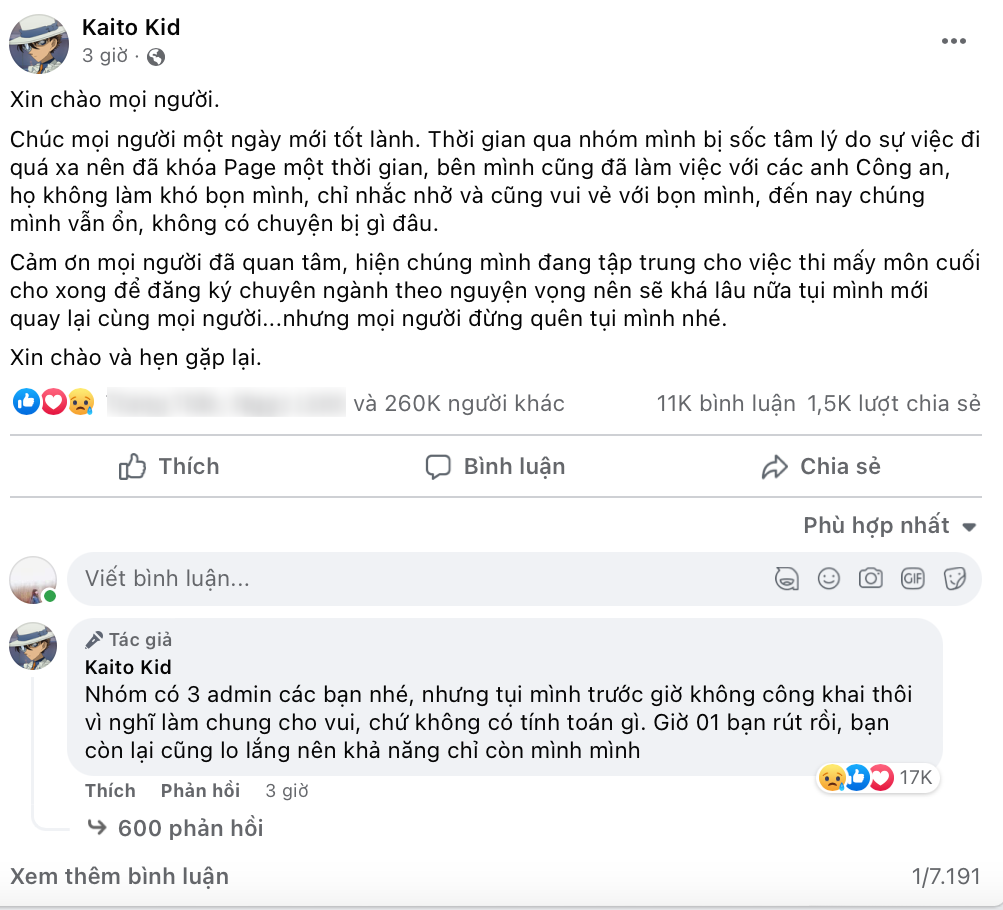 "Xin chào mọi người. Chúc mọi người một ngày mới tốt lành. Thời gian qua nhóm mình bị sốc tâm lý do sự việc đi quá xa nên đã khóa page một thời gian, bên mình cũng đã làm việc với các anh Công an, họ không làm khó bọn mình, chỉ nhắc nhở và cũng vui vẻ với bọn mình, đến nay chúng mình vẫn ổn, không có chuyện bị gì đâu. Cảm ơn mọi người đã quan tâm, hiện chúng mình đang tập trung cho việc thi mấy môn cuối cho xong để đăng ký chuyên ngành theo nguyện vọng nên sẽ khá lâu nữa tụi mình mới quay lại cùng mọi người... nhưng mọi người đừng quên tụi mình nhé. Xin chào và hẹn gặp lại".