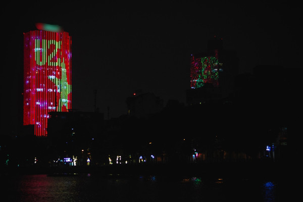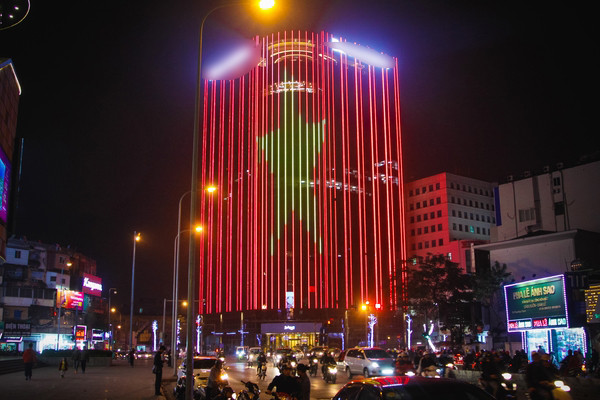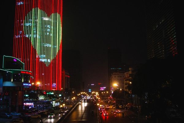 Tòa nhà cao ốc tại ngã tư Thái Hà, Láng Hạ (Hà Nội) rực rỡ một vùng với dòng cổ vũ U23 Việt Nam.