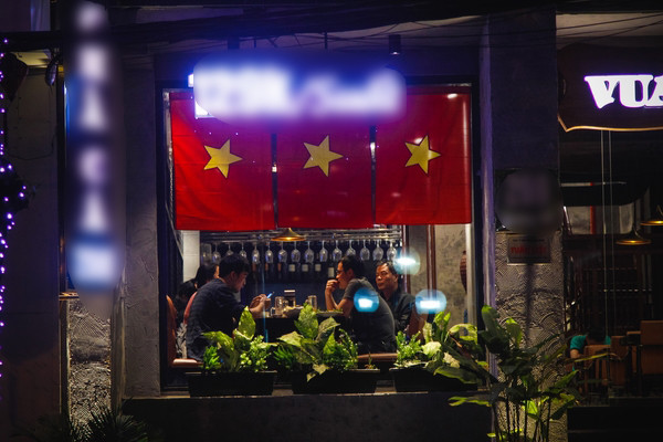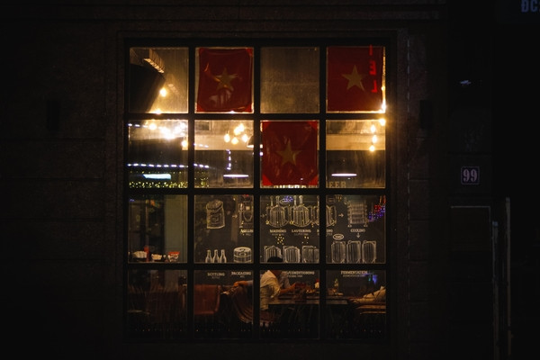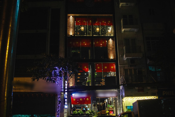 Cờ đỏ sao vàng treo khắp các ô cửa của một cửa hàng ăn trên phố Giảng Võ (Hà Nội).