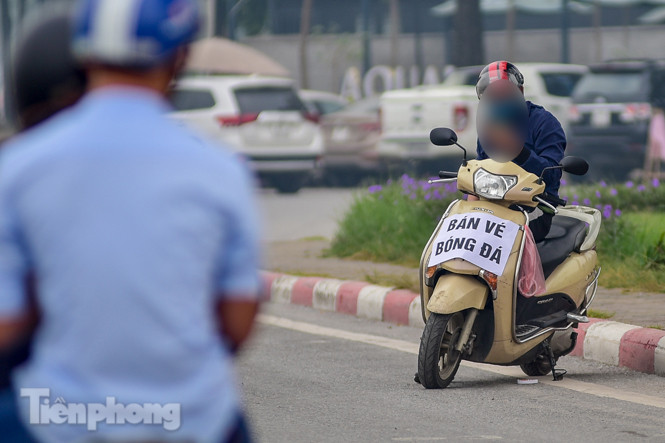 Một "phe vé" ngang nhiên công khai bán vé bóng đá trước cửa SVĐ Mỹ Đình.