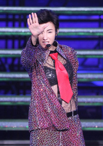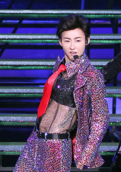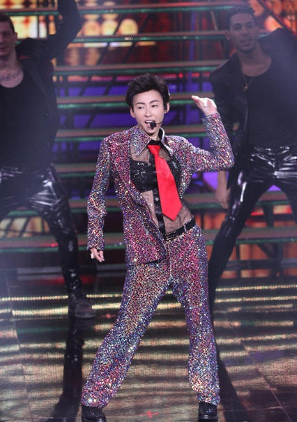 Người đẹp 35 tuổi thường xuất hiện với mái tóc dài quen thuộc nhưng lần này khán giả rất bất ngờ khi thấy cô ăn vận nam tính, diện áo ren xuyên thấu lộ nội y, thắt cà vạt và để tóc tém biểu diễn sôi động.