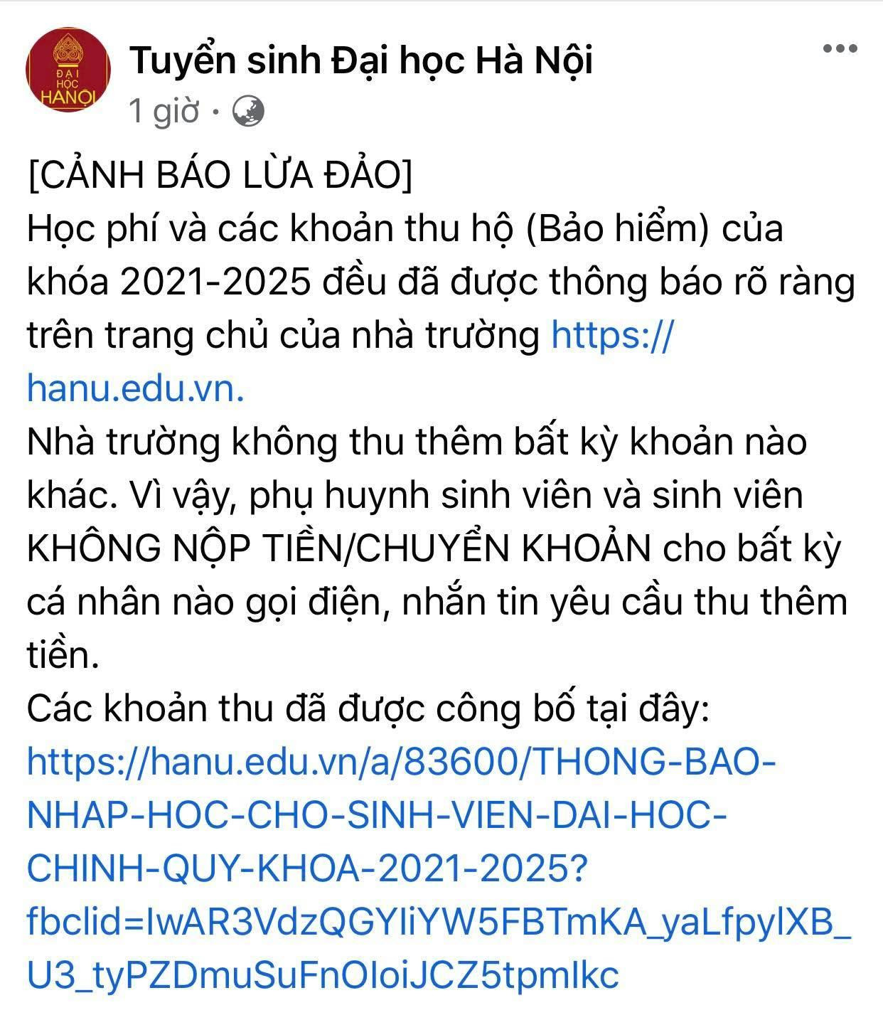 Hôm nay, trên fanpage của trường ĐH Hà Nội cũng đã chuyển tải cảnh báo lừa đảo đối với các tân sinh viên khi phải xác nhận nhập học, nhập học trực tuyến.