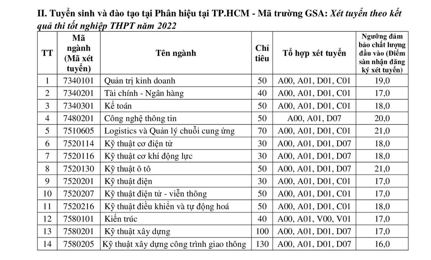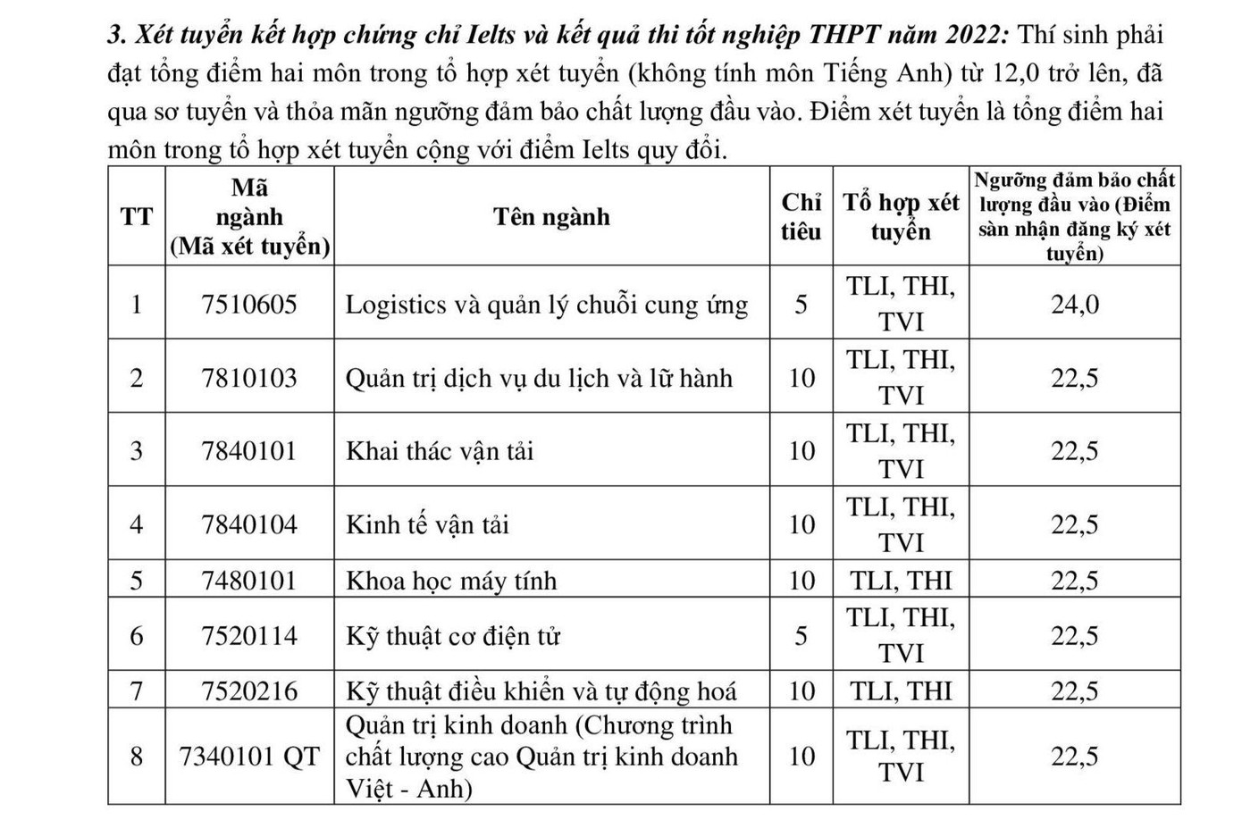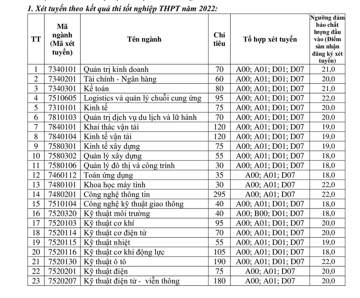Theo đó, đối với phương thức xét kết quả thi tốt nghiệp THPT, ngưỡng đảm bảo chất lượng (điểm sàn) của Trường Đại học (ĐH) Giao thông Vận tải dao động từ 17 - 22 điểm đối với cơ sở phía Bắc. Cơ sở phía Nam từ 16 - 21 điểm.